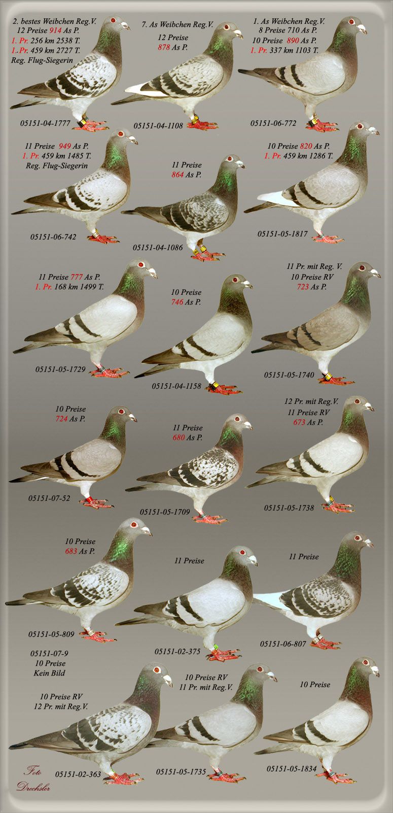 19 zweistellige Preisflieger 9 x 1. Preis Altflug 2 x 1. Preis Jungflug (3 Flüge) 87 Preise in den Top Ten 2.,3.,6.,9.,10.,12.,14.,18.,19., beste Tauben 1.,2.,3.,5.,7.,9.,14.,15.,17..beste Weibchen 1.,3.,4.,5.As Weibchen 1. Nationalpreis des Verbandes |