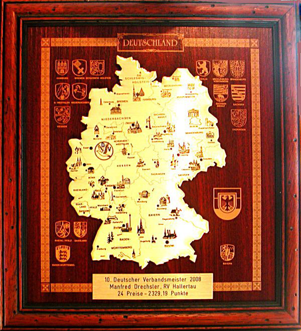 10. Verbandsmeister BRD 1. Reg.Verb.Meister 755 Donau Lech 4 Preise pro Flug (40 Tauben) durchschnitlich 1928 Tauben pro Preisflug. Mit den Preisen: 1.,1.,1.,1.,2.,2.,2.,2.,2.,2.,3.,4.,4.,4.,4.,4.,5.,6.,8.,8.,8.,10., 18.,19.,26.,36.,44.,61.,63.,101.,103.,u.123. Preis ![]() Aufgrund der Neuregelung für die Verbandsmeisterschaft wurden 2008 die Tauben in 2 Schläge unterteilt. Ich begann die Reisesaison mit 40 Tauben, 36 Weibchen 4 Vögel. Meine Ehefrau Marille begann mit 70 Tauben 47 jährige und 23 alte Vögel. Die Teilung der Reisemannschaft hatte für mich auch noch einen besonderen Aspekt, denn ich wurde immer wieder auf die grosse Taubenzahl angesprochen, weil man da ja leicht überall Meister werden kann. Die Auswertungen zeigen jedoch, daß nicht die Masse maßgebend ist, denn bis auf die Jährig. Reg.Verb. Meistersch. wurden alle unten aufgeführten Meisterschaften mit 40 Tauben errungen. |