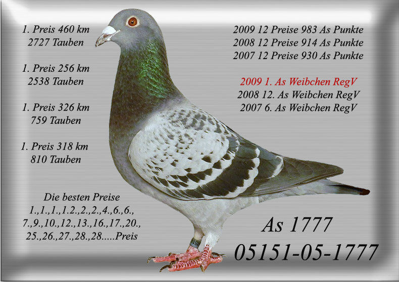 8 x 1. Preis Altflug 3 x 1. Preis Jungflug (4 Flüge) 79 Preise in den Top Ten 2.,4.,5.,15.,16.,17.,21.,25.....beste Tauben 2.,3.,4.,11.,12.,13.,17.,25..beste Weibchen 1.,5.,6.,7.As Weibchen 1. bestes Jungtier 2.,6.,7.,9.,10.,15....best. jähr. Weibchen 2.,11.,16...best. jähr.Vogel |