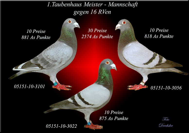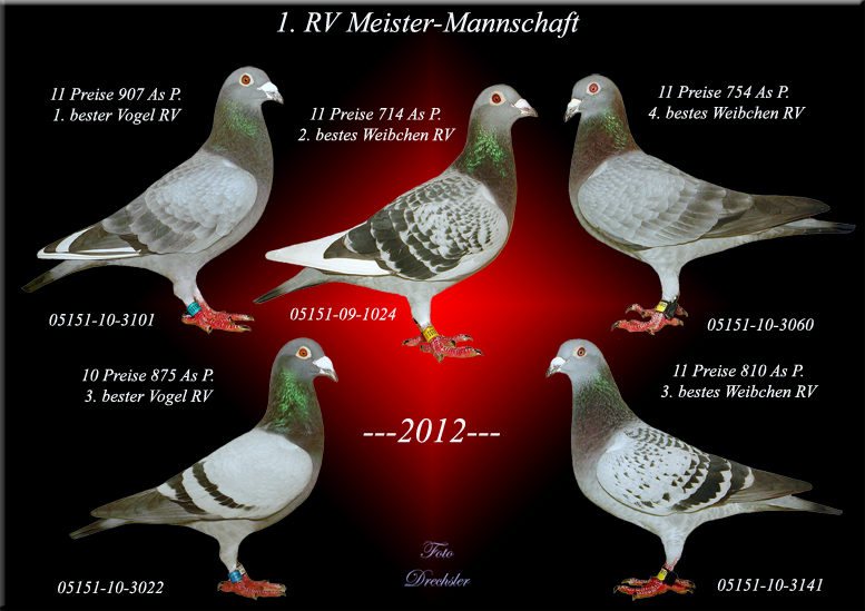 | 1. RV Meister 1. RV Vogelmeister 1. RV Weibchenmeister 1. RV Jährigenmeister 1. RV Meister des Verbandes 1. VB-Jährigenmeister 1. VB- Weitstreckenmeister 1. VB- Mittelstreckenmeister 1. Meisterschaft die Brieftaube 1. Klinik-Cup |