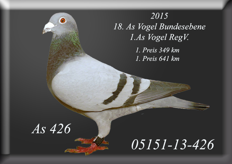 5 x 1. Preis Altflug 3 x 1. Preis Jungflug 2.,3.,25.,29.,34.,43.,bester Vogel RV 6.,8.,10.,11.,15.,19.,30.,33.,bestes Weibchen RV 1. As Vogel des Verbandes 1. As Weibchen des Verbandes 2. As Taube des Jahres 909 As Punkte 3. As Taube des Jahres 865 As Punkte 1. 2er- Serie Endflug 641 km 1.und 2. Preis |